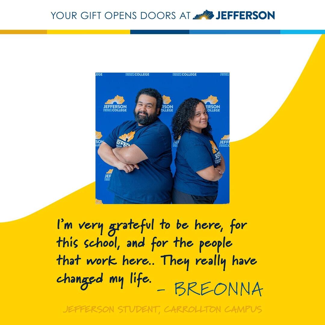 The Jefferson Community & Technical College Foundation (Jefferson Foundation) is a 501c3 organization that supports the faculty, staff, and students of Jefferson Community & Technical College (Jefferson). With the primary location of Louisville, Kentucky, Jefferson has 6 campuses including Southwest Jefferson, Bullitt County, Carrollton, Shelby County, and 2 locations in Downtown Louisville. All funds raised by the Jefferson Foundation go directly to support programming, students, and facilities of Jefferson.